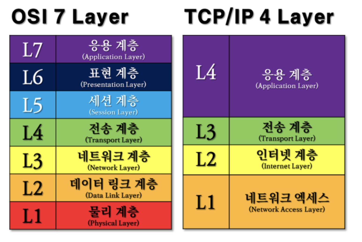 즉, 네트워크 전송시에, 데이터 표준을 정리한 것이 OSI 7계층, 이 이론을 실제 사용하는 인터넷 표준이 TCP/IP 4계층이다.